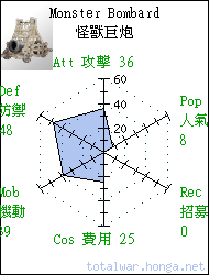 Monster Bombard 怪獸巨炮 missile siege Massive Siege-Gun. Can destroy nearly any wall in one shot. Has very long range but slow reload time. 怪獸巨炮為巨型攻城炮,幾乎 一炮既可轟塌任何城牆,其射 程極遠,但裝填速度緩慢。