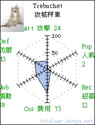 Trebuchet 攻城秤車 missile siege Giant rock flinging artillery piece. Capable of flaming and normal shot. Also able to fling diseased cows! 攻城秤車為巨型投擲攻城武器, 可投擲巨石、火球和腐爛牛屍。