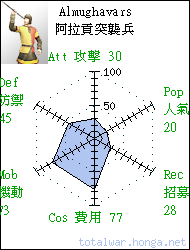 Almughavars 阿拉貢突襲兵 missile infantry Elite light infantry skirmishers armed with javelins and spears, and sometimes armour. 阿拉貢突襲兵是精銳的職業輕 裝突襲部隊,裝備標槍和長矛, 有時亦會身穿盔甲。