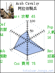 Arab Cavalry 阿拉伯騎兵 light cavalry Light cavalry recruited from settled areas, and well suited to taking on archers, light infantry and other light cavalry. 阿拉伯騎兵來自於遍佈北非和 中東的阿拉伯部落,擅長驅逐 敵軍弓騎以及對抗敵軍輕裝部 隊。