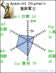 Armoured Sergeants 重裝軍士 spearmen infantry Trained and hardened warriors protected by a large shield and mail. Armed with spears and able to form a defensive ring of spears. 重裝軍士是訓練有素的精銳部 隊,手持巨盾和長矛,必要時 可列圓陣接敵。