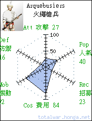Arquebusiers 火繩槍兵 missile infantry Fired at close range, this noisy, smokey and lethal weapon causes morale damage as well as physical hurt. 火繩槍兵通常近距離齊射,發 射時的硝煙和巨響令這種恐怖 武器極為震撼人心,無論精神 還是肉體上都給敵軍致命打擊。