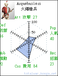 Arquebusiers 火繩槍兵 missile infantry Fired at close range, this noisy, smokey and lethal weapon causes morale damage as well as physical hurt. 火繩槍兵通常近距離齊射,發 射時的硝煙和巨響令這種恐怖 武器極為震撼人心,無論精神 還是肉體上都給敵軍致命打擊。