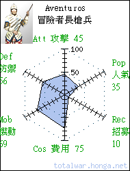 Aventuros 冒險者長槍兵 spearmen infantry Impetuous and hot blooded gentry, armed with pikes and excellent armour, this elite unit is one of the best pike units available. 冒險者部隊由衝動無畏的貴族 們組成,配備精良鏈甲或板甲, 使用長槍作戰,堪稱最為精銳 的長槍步兵。