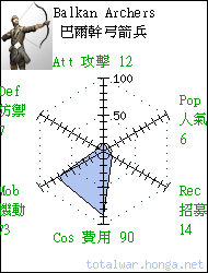 巴爾幹弓箭兵來自生活貧困的農民,他們紛紛逃離艱辛的歲月,踏上傭兵生涯,為金錢效命。弓箭兵們無論訓練程度和裝備都十分低下,但維護費用極廉,以此換取立身之地。
