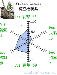 Broken Lances 獨立槍騎兵 heavy cavalry Broken lances are well trained and experienced professional soldiers, protected by plate armour, armed with lances and swords. 獨立槍騎兵是經驗豐富軍紀嚴 明的職業部隊,身穿意大利精 良板甲,手持沉重騎槍和長劍。