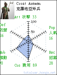 克羅地亞步兵以凶悍戰斧聞名於世。這些強悍戰士身穿輕甲,雙手揮動致命巨斧,灑出漫天血雨,若在家鄉崎嶇地形作戰則更為恐怖。在對抗弓箭和輕裝部隊時,他們幾乎是殺戮機器。