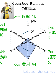 Crossbow Militia 持弩民兵 missile infantry Crossbow Militia are peasant crossbowmen called up to defend settlements. Very poorly armoured. 持弩民兵是裝備軍弩的農夫, 應徵入伍為城邑提供遠程防禦 力量,盔甲十分簡陋。