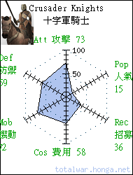 Number of turns to build, Cost of unit to construct, Cost of upkeep, Cost of upgrading weapons, Cost of upgrading armour, Cost for custom battles, Limit in custom battle, Cost for punish 徵召回合, 招募費, 維持費, 升級武器, 升級盔甲, 自訂戰役, 多於幾隊, 懲罰金額