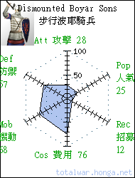 Dismounted Boyar Sons 步行波耶騎兵 heavy infantry These young adventurers wear light mail or light brigandine armour and carry an axe. 步行波耶騎兵身穿輕型鏈甲或 鑲甲,手持長斧,極為驍勇善 戰。