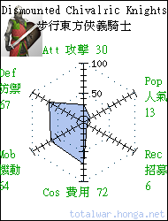 Dismounted Chivalric Knights 步行東方俠義騎士 heavy infantry Elite heavy infantry influenced by western techniques, well armoured and well trained, but can act rashly. 步行東方俠義騎士是深受西方 技術影響的精銳騎兵,盔甲精 良,訓練有素,但有時會不遵 軍令魯莽出擊。