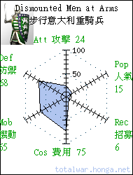 Dismounted Men at Arms 步行意大利重騎兵 heavy infantry Dismounted, these men are effective and well protected infantry. 步行意大利重騎兵是身穿重甲, 頗為出色的步兵部隊。