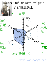 Dismounted Norman Knights 步行諾曼騎士 heavy infantry Exceptional knights, even when dismounted. Armed with swords and mail. 諾曼騎士裝備重型鏈甲和鋒利 長劍,極為驍勇善戰。