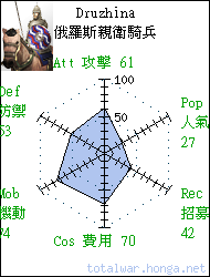 Druzhina 俄羅斯親衛騎兵 heavy cavalry Fierce cavalry warriors wearing mail armour and armed with spear and a wicked axe, acting as bodyguards for Chieftains. 凶殘的親衛騎兵裝備鏈甲、騎 槍和戰斧,護衛親王大公。