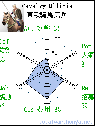 Cavalry Militia 東歐騎馬民兵 heavy cavalry Cavalry militia are poorly trained and equipped, but are still capable of charging down the right enemy 騎馬民兵訓練和裝備都較為薄 弱,但若戰術得當,仍可發揮 作用。