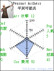 Peasant Archers 平民弓箭兵 missile infantry A peasant archer is armed with a small bow and knife. Not to be relied upon. 平民弓箭兵裝備獵弓和短刀, 表現平平,不能寄予過高期望。
