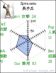 Spearmen 長矛兵 spearmen infantry Regular troops comprised of freemen, equipped with some armour and a spear, able to form a defensive ring of spears. 長矛兵出身自由民,裝備長矛 和盔甲,能夠以圓陣拒敵。