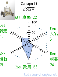 Catapult 投石車 missile siege Older style rock-flinging wooden artillery piece. Can throw flaming and normal shots. 投石車為投擲巨石的木質器械, 可投擲巨石和火球。