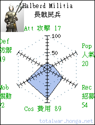 Halberd Militia 長戟民兵 heavy infantry Militia units armed with a halberd which can fend off cavalry, and pierce or crush armour. 長戟民兵擅長對抗騎兵,其手 中長戟破甲極為有效。