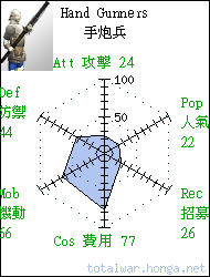 Hand Gunners 手炮兵 missile infantry Earliest hand-held firearm unit. Causes more fear than actual damage. These soldiers need to be capable in close combat due to the short range of their weapons. 手炮兵是早期手持火槍部隊, 對敵軍的心理震撼遠甚於其實 際殺傷。由於手炮射程較短, 士兵們必須應付近身肉搏。