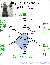 蘇格蘭將領們深知己方弓箭兵技藝遠遜南部同儕,故而特別組建這支部隊。弓箭兵們來自蘇格蘭高地,使用標準戰弓,此外亦配備單手戰斧以備肉搏,部分幸運士兵尚可裝備鑲片皮甲。