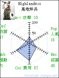 高地斧兵是來自蘇格蘭高地剽悍驍勇的戰士。他們體格健壯,作戰驍勇,為獲得戰利品和奴隸,儘管自身盔甲簡陋,依然揮動戰斧盾牌,奮勇搏殺劫掠。高地斧兵軍紀極差,惡名遠播,儘管悍不畏死,但遠非職業重裝部隊敵手。