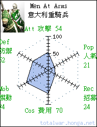 Men At Arms 意大利重騎兵 heavy cavalry Well equipped heavy cavalry with plate armour and a lance. 意大利重騎兵是裝備板甲和騎 槍的重裝騎兵。