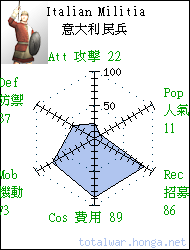 Italian Militia 意大利民兵 light infantry Local militias play an important role in Italian armies. These troops are armed with short spear and shield. 民兵部隊在意大利軍中地位頗 重,裝備短矛和盾牌。