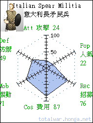 Italian Spear Militia 意大利長矛民兵 spearmen infantry Experienced and well trained local militia equipped with good armour and a spear, able to form a defensive ring of spears. 長矛民兵久經戰陣,訓練有素, 裝備精良盔甲和長矛,能夠以 圓陣拒敵。
