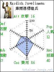 Kurdish Javelinmen 庫爾德標槍兵 missile infantry Hardy troops who soften the enemy with their javelins, then finish them off with their swords. 庫爾德標槍兵通常率先標槍飛 擲,而後揮劍衝入敵陣,浴血 廝殺。