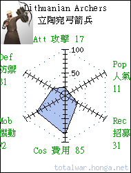 Number of turns to build, Cost of unit to construct, Cost of upkeep, Cost of upgrading weapons, Cost of upgrading armour, Cost for custom battles, Limit in custom battle, Cost for punish 徵召回合, 招募費, 維持費, 升級武器, 升級盔甲, 自訂戰役, 多於幾隊, 懲罰金額