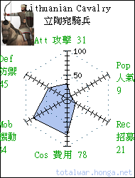 Lithuanian Cavalry 立陶宛騎兵 missile cavalry Fierce East European horse archers. Lightly armoured, but still enjoy a good hand to hand scrap. 立陶宛騎兵是精銳的東歐弓騎 兵,儘管盔甲簡陋,但仍喜近 身搏殺。