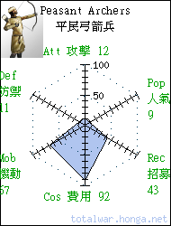 Peasant Archers 平民弓箭兵 missile infantry Accustomed to using their bow for hunting, these peasant archers are armed with a small bow and knife. 平民弓箭兵裝備獵弓和短刀, 表現平平,不能寄予過高期望。