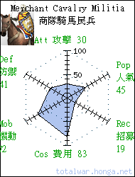 Merchant Cavalry Militia 商隊騎馬民兵 heavy cavalry Poorly trained, but well equipped cavalry who fight with a sword. 商隊騎馬民兵以長劍作戰,他 們裝備精良,但訓練較差。