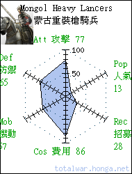 Mongol Heavy Lancers 蒙古重裝槍騎兵 heavy cavalry Elite shock troops who exchange mobility for heavier armour. 蒙古重裝槍騎兵無論人馬都身 披重鎧,以犧牲機動力換取防 護能力,是極為精銳的格鬥騎 兵。