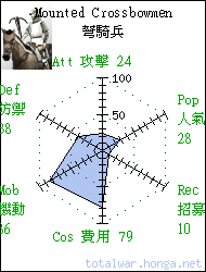 Mounted Crossbowmen 弩騎兵 missile cavalry Using smaller crossbows than the infantry, these units use their mobility to stay out of trouble while they reload. 弩騎兵使用較步兵弩更為小巧 的騎弩,發射後利用騎兵優勢 遠避敵軍從容裝填。