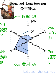 Mounted Longbowmen 長弓騎兵 missile cavalry The advantage of being mounted allows a longbowman to flank his enemies and ride out of danger. Not to be mistaken for true cavalry though. 騎馬作戰令這些長弓兵極為機 動靈活,可以從側翼殺傷敵軍, 然後迅速策馬遠遁,但絕對不 能令其遭遇近身搏殺。