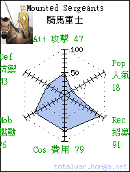 Mounted Sergeants 騎馬軍士 light cavalry These veteran warriors wear light armour and are armed with a spear and a sword. 騎馬軍士身穿輕甲,手持長矛 和利劍。
