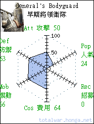 Number of turns to build, Cost of unit to construct, Cost of upkeep, Cost of upgrading weapons, Cost of upgrading armour, Cost for custom battles, Limit in custom battle, Cost for punish 徵召回合, 招募費, 維持費, 升級武器, 升級盔甲, 自訂戰役, 多於幾隊, 懲罰金額