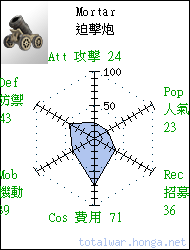 Mortar 迫擊炮 missile siege A siege weapon capable of firing over walls and plunging shots down on enemies hiding behind said walls. 迫擊炮的曲射彈道能夠避開前 方障礙轟擊縱深敵軍。