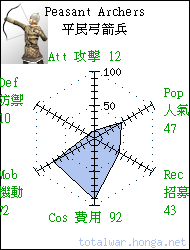 Peasant Archers 平民弓箭兵 missile infantry A peasant archer is armed with a small bow, and a knife. Unreliable, and only moderately effective as archers. 平民弓箭兵裝備獵弓和短刀, 士氣低落,只能作為遠程部隊 使用。