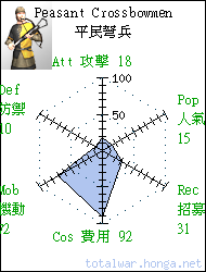 Peasant Crossbowmen 平民弩兵 missile infantry Peasant crossbowmen are armed with a crossbow, knife and if lucky enough, some armour. 平民弩兵裝備軍弩和飛刀,部 分幸運士兵尚可配備輕型鏈甲。