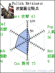 Polish Retainers 波蘭扈從騎兵 heavy cavalry Wearing brigandine armour, and armed with a lance and sword, this unit is capable of devastating charges. 扈從騎兵身穿鑲片皮甲,手持 騎槍和長劍,衝鋒威力亦頗為 驚人。