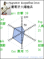 Portuguese Arquebusiers 葡萄牙火繩槍兵 missile infantry Effective unit, capable of giving a volley with their guns, then following up with swords. 葡萄牙火繩槍兵作戰出色,通 常以火槍率先齊射,而後揮劍 殺入敵陣。
