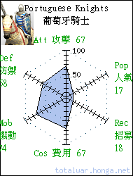 Portuguese Knights 葡萄牙騎士 heavy cavalry Elite and experienced knights protected by plate armour, barding and armed with lances and swords. 葡萄牙騎士全身裝備板甲,手 持騎槍和長劍,戰馬亦披掛厚 氈馬鎧。作戰經驗豐富,堪稱 騎兵精銳。