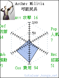 Number of turns to build, Cost of unit to construct, Cost of upkeep, Cost of upgrading weapons, Cost of upgrading armour, Cost for custom battles, Limit in custom battle, Cost for punish 徵召回合, 招募費, 維持費, 升級武器, 升級盔甲, 自訂戰役, 多於幾隊, 懲罰金額