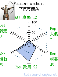 Peasant Archers 平民弓箭兵 missile infantry A peasant archer is armed with a small bow, and a knife. Unreliable, and only moderately effective as archers. 平民弓箭兵裝備獵弓和短刀, 士氣低落,只能作為遠程部隊 使用。