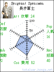 Sergeant Spearmen 長矛軍士 spearmen infantry Trained and hardened warriors, protected by a large shield, armed with spears and able to form a defensive ring of spears. 長矛軍士是訓練有素的精銳部 隊,手持巨盾和長矛,必要時 可列圓陣接敵。