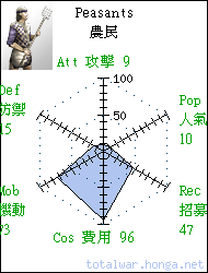 Peasants 農民 light infantry In times of war peasants are forced from their farms and drafted into levies. Good cannon fodder. 農民經常在戰時被強行徵召入 伍,充任廉價炮灰。