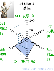 Peasants 農民 light infantry In times of war peasants are forced from their farms and drafted into levies. Good cannon fodder. 農民經常在戰時被強行徵召入 伍,充任廉價炮灰。